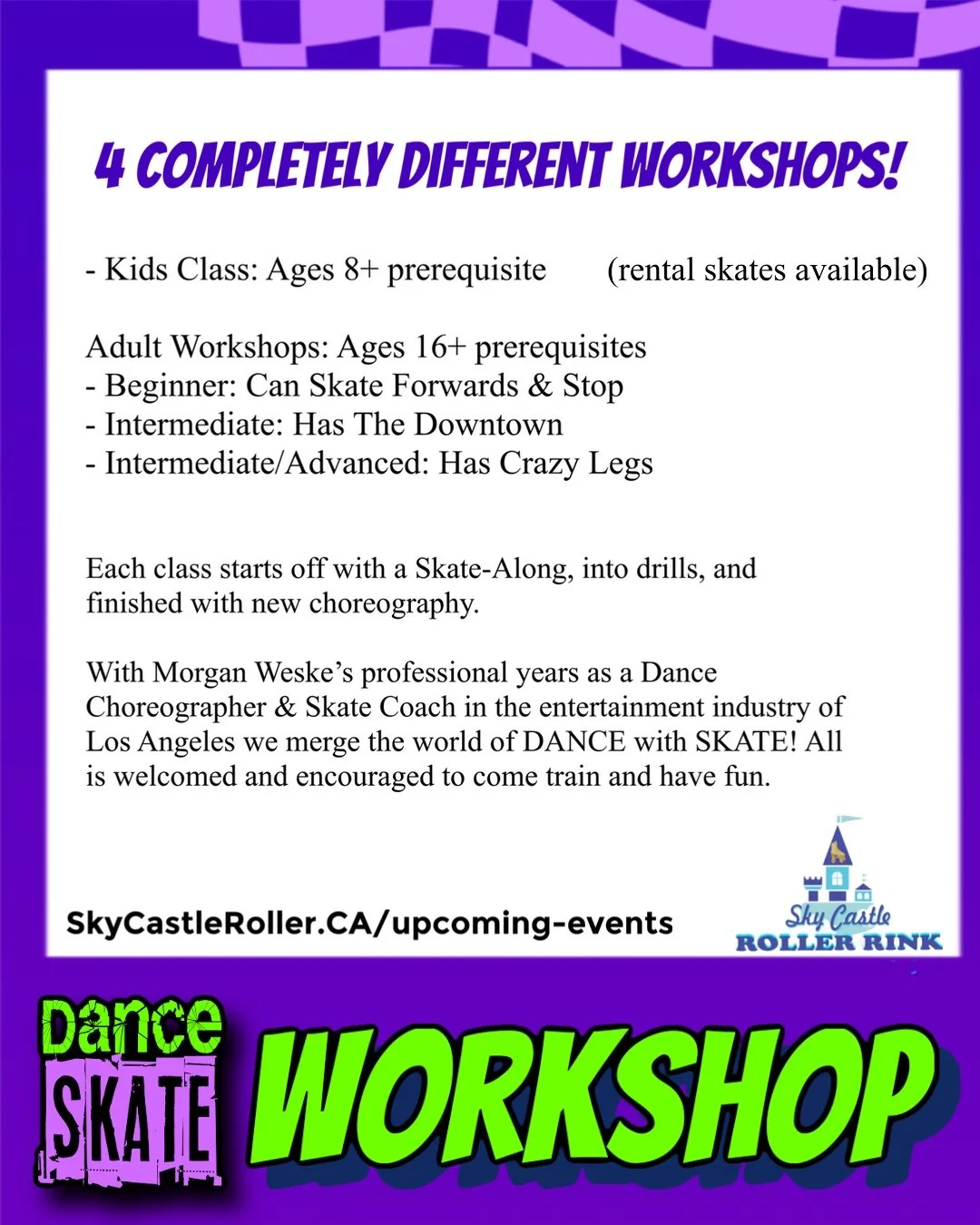 Get ready for an exciting weekend at SkyCastle Roller Rink! We are excited to welcome Morgan Weske, a seasoned professional dancer, roller skater, choreographer, producer, and director with over 15 years of experience, to lead our Dance Skate Workshop Weekend.