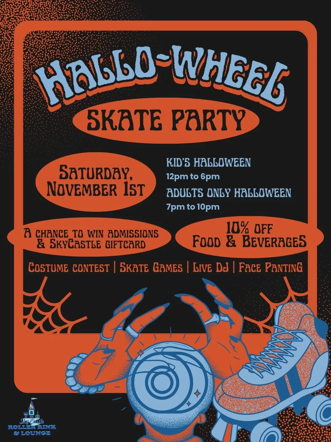 Get ready for a frighteningly fun time at the SkyCastle Hallo-Wheel Skate Party on Saturday, November 1, 2025! We're rolling out a full day of spooky skating, games, contests, and treats for all ages.