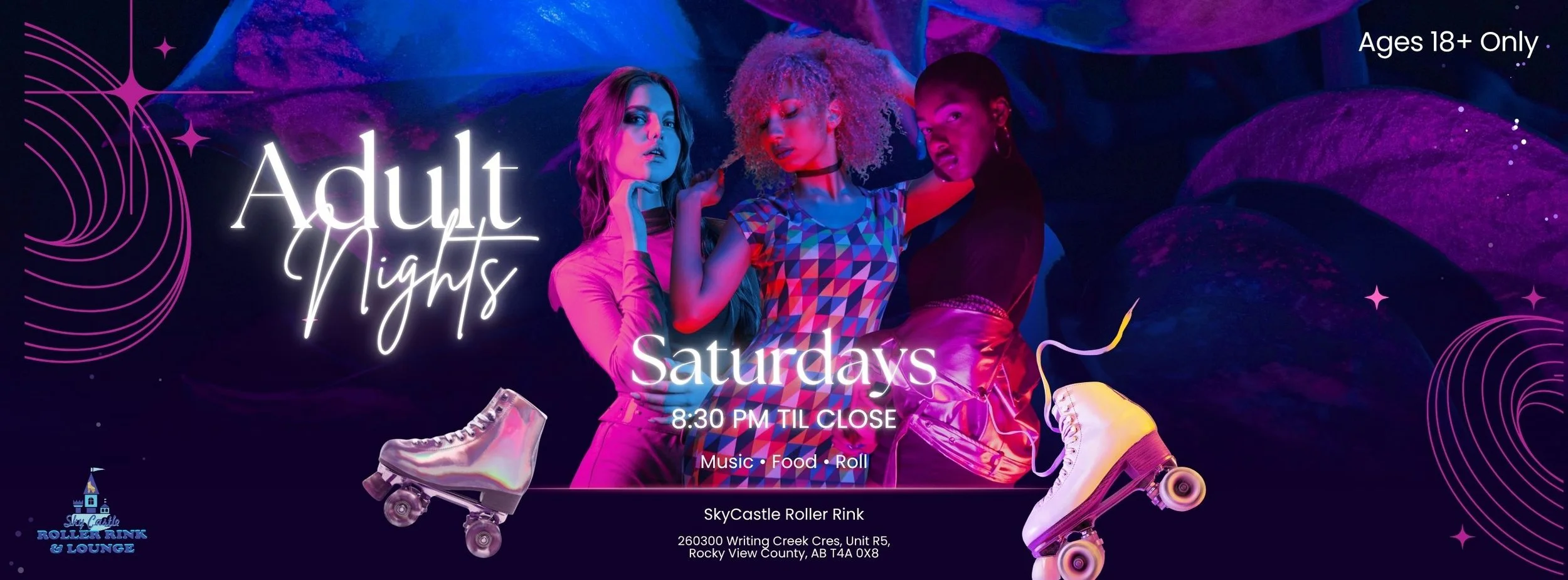 Saturday night belongs to the adults at SkyCastle. Starting at 8:30 PM, we clear the floor for the 18+ crowd to take over the rink until close.